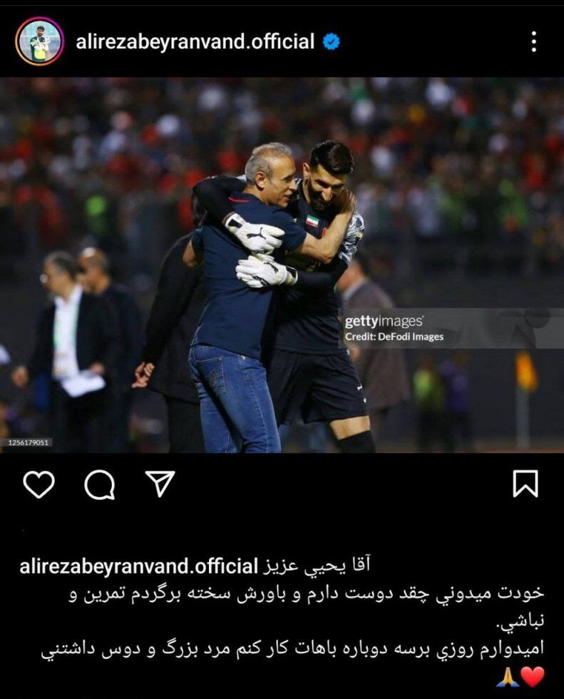 علیرضا بیرانوند دروازهبان پرسپولیس تصویری از یحیی گلمحمدی در اینستاگرام منتشر کرد و نوشت: آقا یحیی عزیز خودت میدونی چقدر دوست دارم و باورش سخته برگردم تمرین و نباشی. امیدوارم روزی برسه دوباره باهات کار کنم مرد بزرگ و دوست داشتنی.